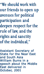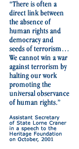 We are launching a new initiative to assist local human rights defenders in the closed societies of the Middle East. The terrible events of September 11, 2001 have underlined the urgent need for human rights progress in this region. The seeds of political violence are being sown in societies where avenues for peaceful political participation are blocked. These are not localized problems - although many Middle Eastern societies have suffered grievously from political violence. Rage and frustration about political conditions in one part of the world may be expressed in another with destructive consequences. The stalled societies of the Middle East need
